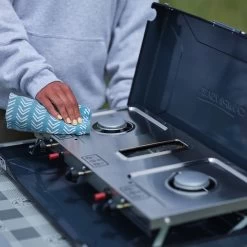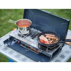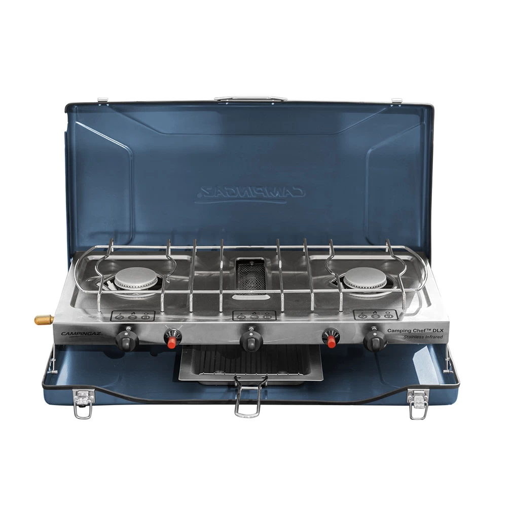 A fantastic camping stove to cook up a treat on your family camping holiday, this Campingaz Chef DLX Stainless Infrared Gas Stove features two 1500W burners with reliable push and turn controls that can be used simultaneously with an infrared grill with grill pan. Perfect for making tea and toast on the move to a full family meal, the stove features child safety knobs and integrated wind shields ideal for cooking in all conditions. It is easy to clean thanks to removable, stainless steel burners and packs down neatly for great portability. A fabulous choice of camp stove.