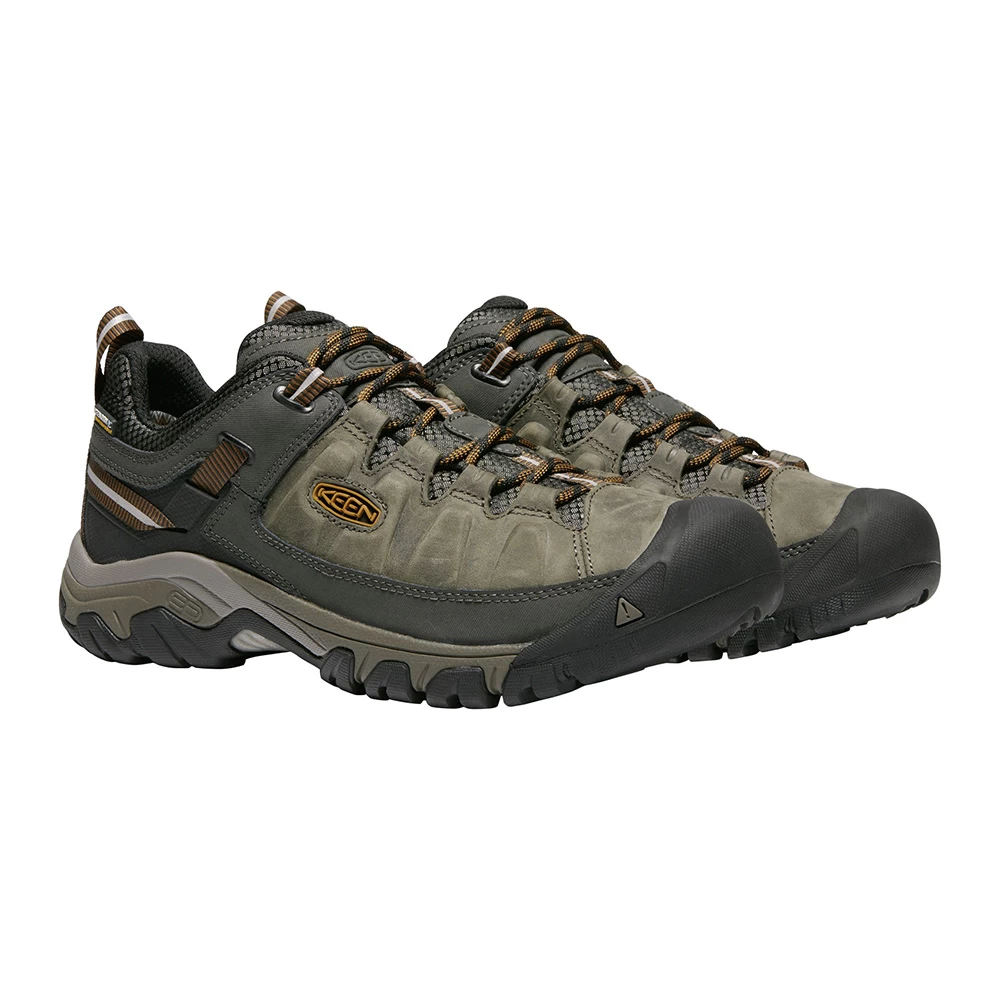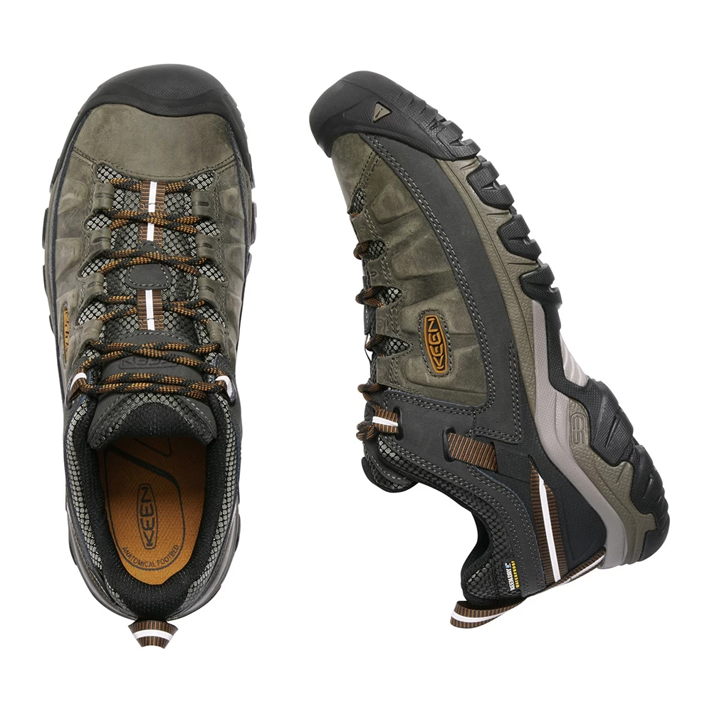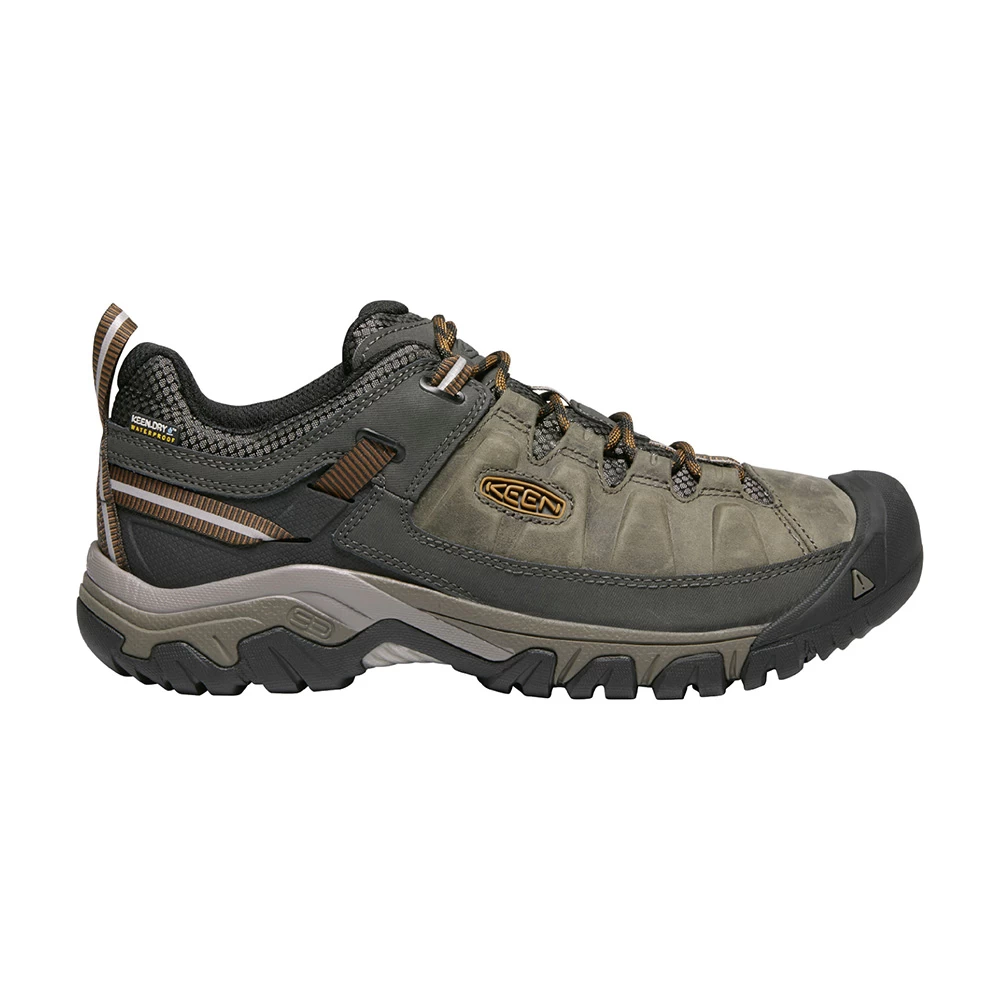 These Targhee III Hiking Shoes from Keen feature an excellent fit, enhanced durability and superb performance, delivering an updated look to your all-terrain adventures. KEEN DRY technology allows vapour out without letting water in to ensure your feet remain comfortable and dry for the duration of your hike. Arch support is provided by the Metatomical Footbed Design, providing excellent arch support and cradling the natural contours of the foot. The KEEN All-Terrain rubber outsole features 4mm multi-directional lugs for high-traction grip. An outstanding all-round hiking shoe in a superb black olive/golden brown colourway.