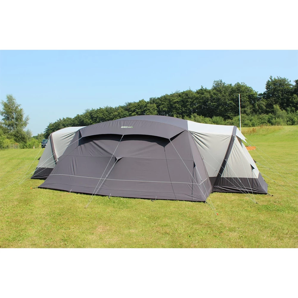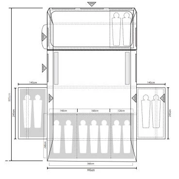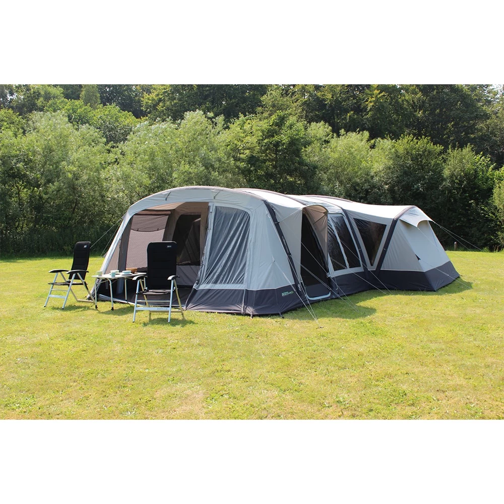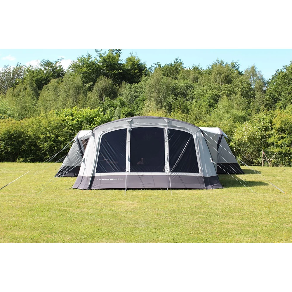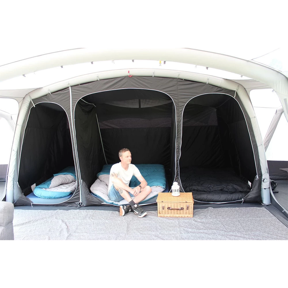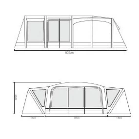 - Double Side Annexe to each side – double multi-functional inflatable side utility annexe, which can be used as an access point, two-berth sleeping area or large storage area – away from the tents main living area. Right side double annexe includes 2 berth sleeping inner tent.