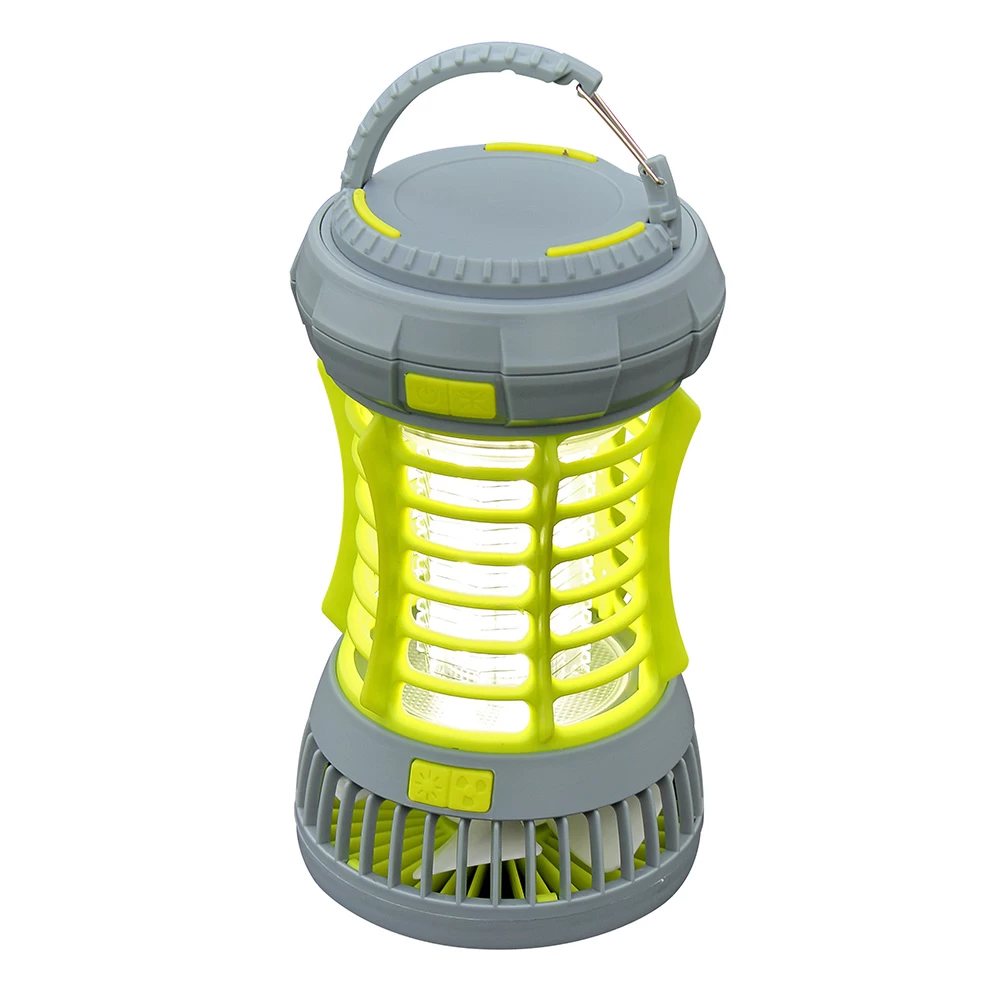 A multifunctional lantern, taking versatility to a new level, this Mosquito Killer Lantern with Fan can be charged via USB and used either as a tabletop light with a pivoting fan head and spotlight as well as having the mosquito-killing function. The unit is light and compact enough to be hung upside down via the hanging loop in the base if preferred. This is a truly multifunctional lantern for those that require a cool fan in hot weather and a mosquito killer in the evenings.