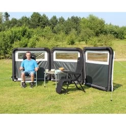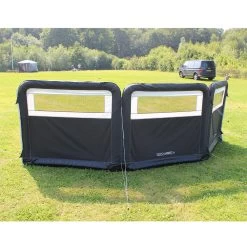 This premium quality windbreak features Outdoor Revolution’s latest 600HDE high-density all-weather premium fabric combined with the ultimate convenience of an inflatable Oxygen Air Frame. Each panel features a PVC panel to retain a view of your surroundings and are joined with a flexible hinged system enabling you to adjust the configuration of the windbreak to suit your preference. The windbreak can be extended using optional single panel extensions.