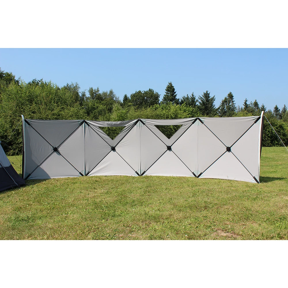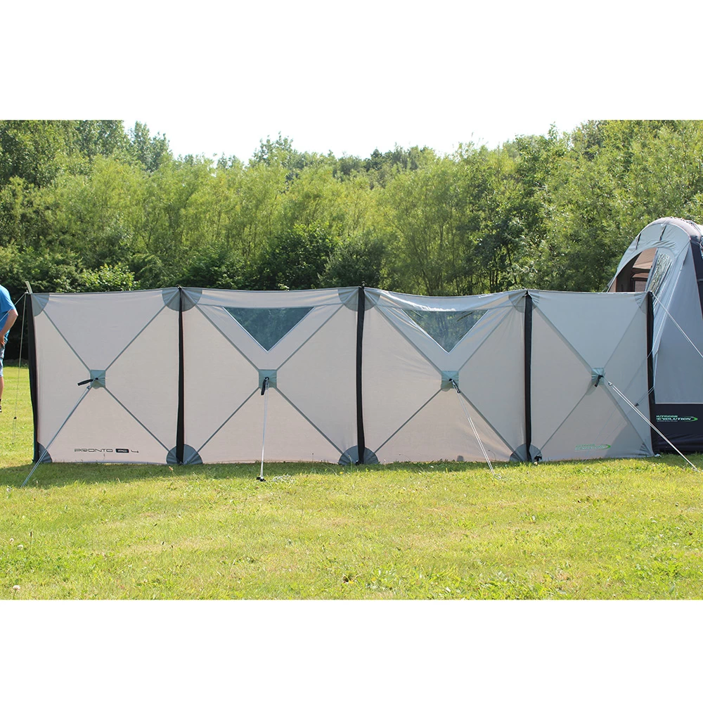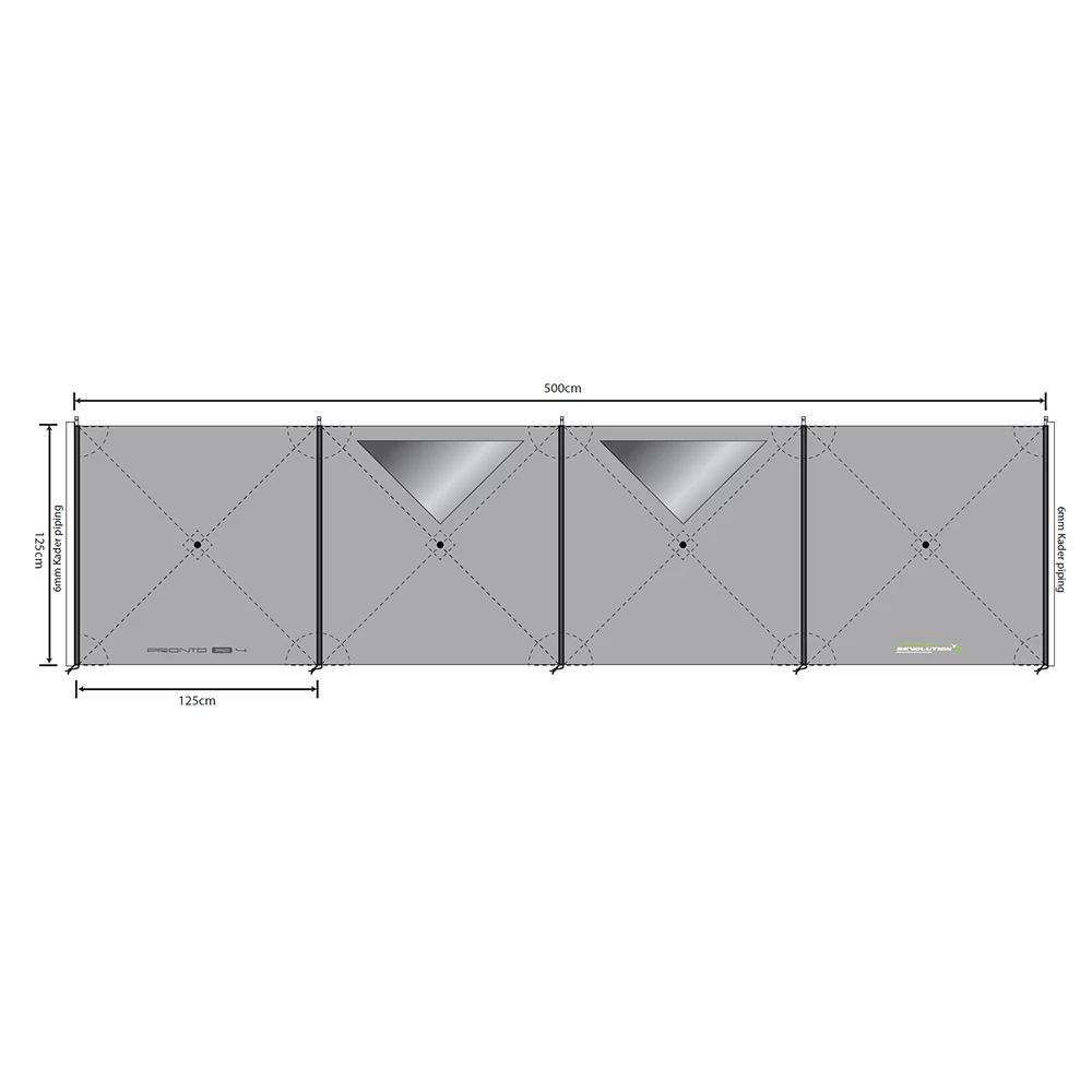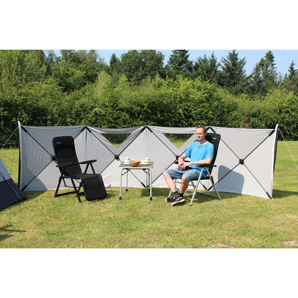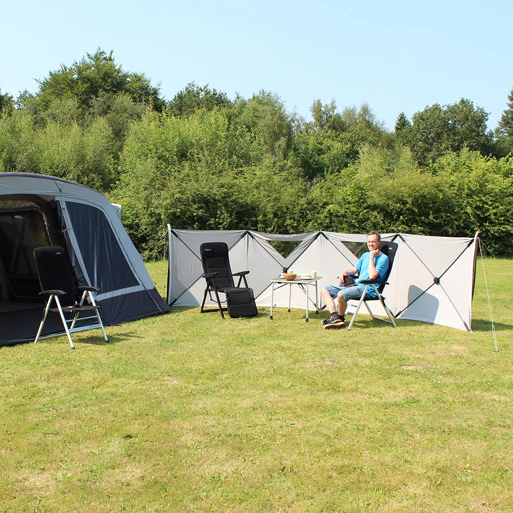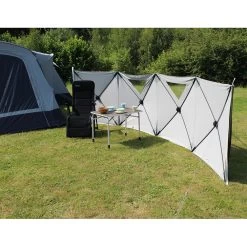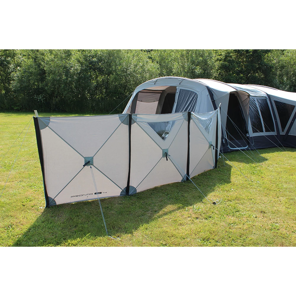 Featuring Outdoor Revolution’s ‘Pronto’ quick erect pop-up system, this incredibly stable polycotton 4 panel windbreak can be pitched in a matter of seconds. Fibreglass upright poles provide extra support, with elasticated bungee peg down points situated to the base of each pole provide great stability. Kader strips feature at both ends of the windbreak – useful for attaching to a vertical awning rail. Designed to compliment Outdoor Revolution polycotton models including Kalahari PC, Movelite PC & Cayman PC.