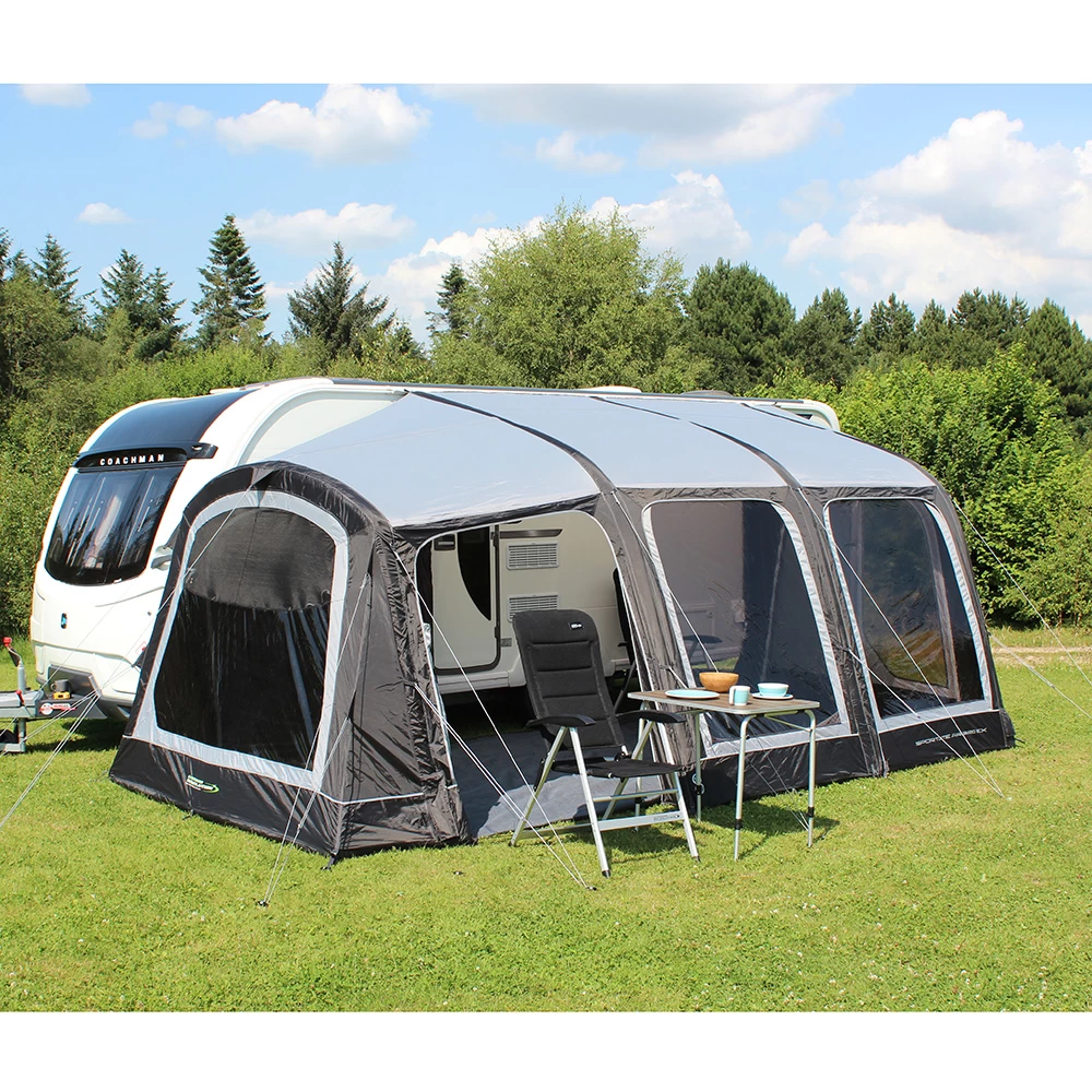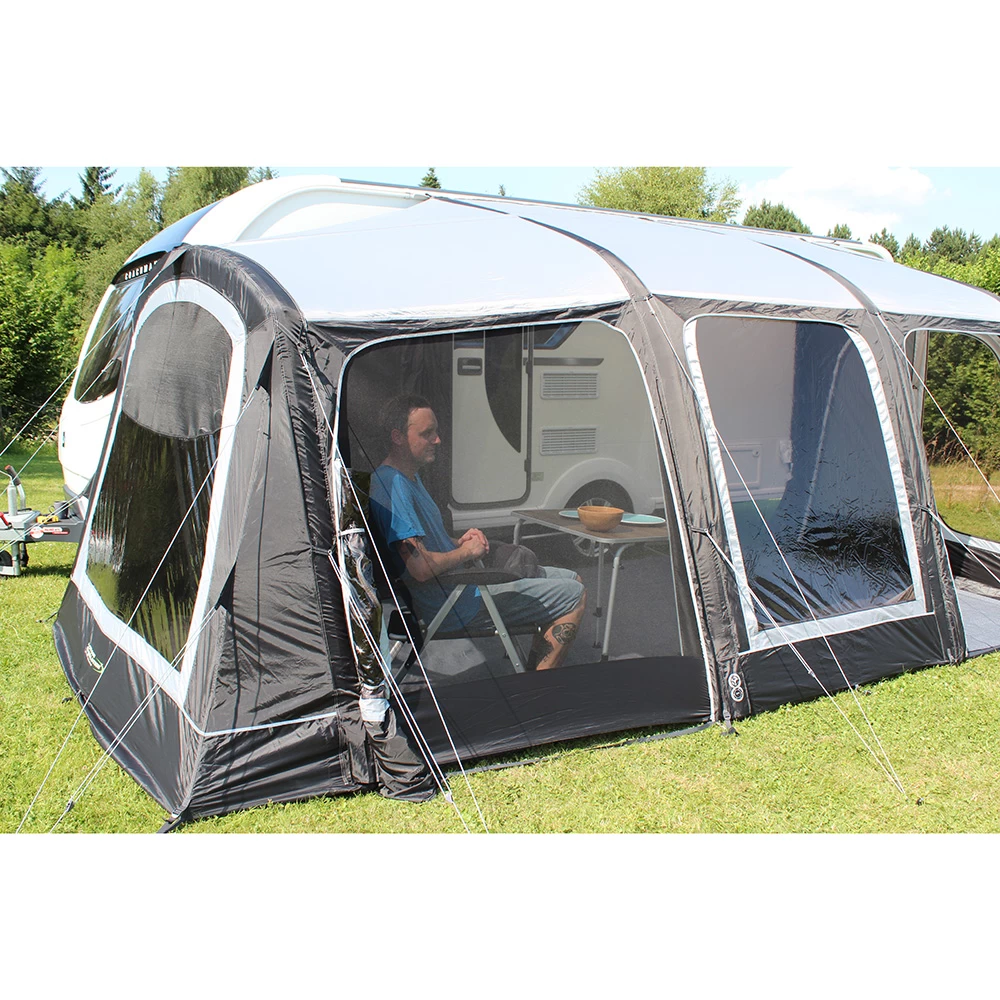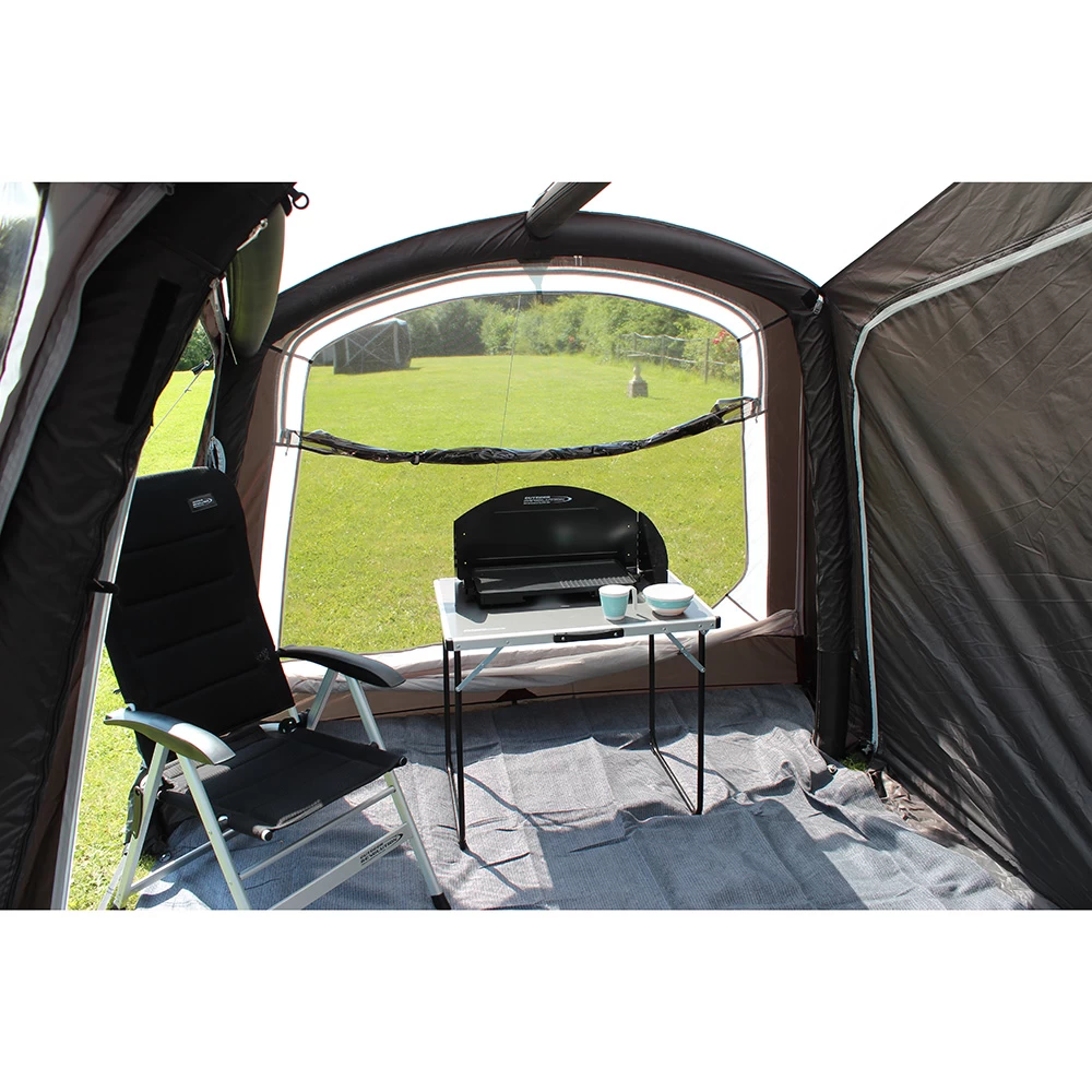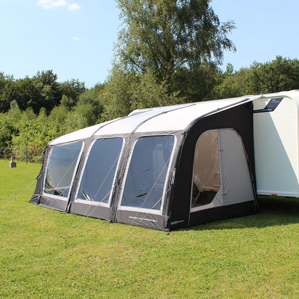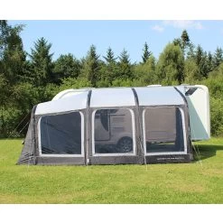 Contemporary aesthetics, functionality and versatility are encapsulated by the new Sportlite 320 EX Air Caravan Awning from Outdoor Revolution, featuring a fantastic integral multifunctional side extension that delivers configuration options aplenty. The integrated extension can be sectioned off, used for storage or a private bedroom area with an optional 2 berth inner and enables a larger awning to be used with a shorter attachment rail. A single point inflation system provides the ultimate in convenient pitching, with a comprehensive feature list making for the perfect touring solution for many an enthusiast.