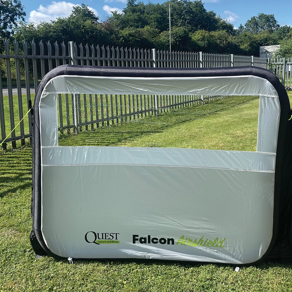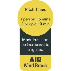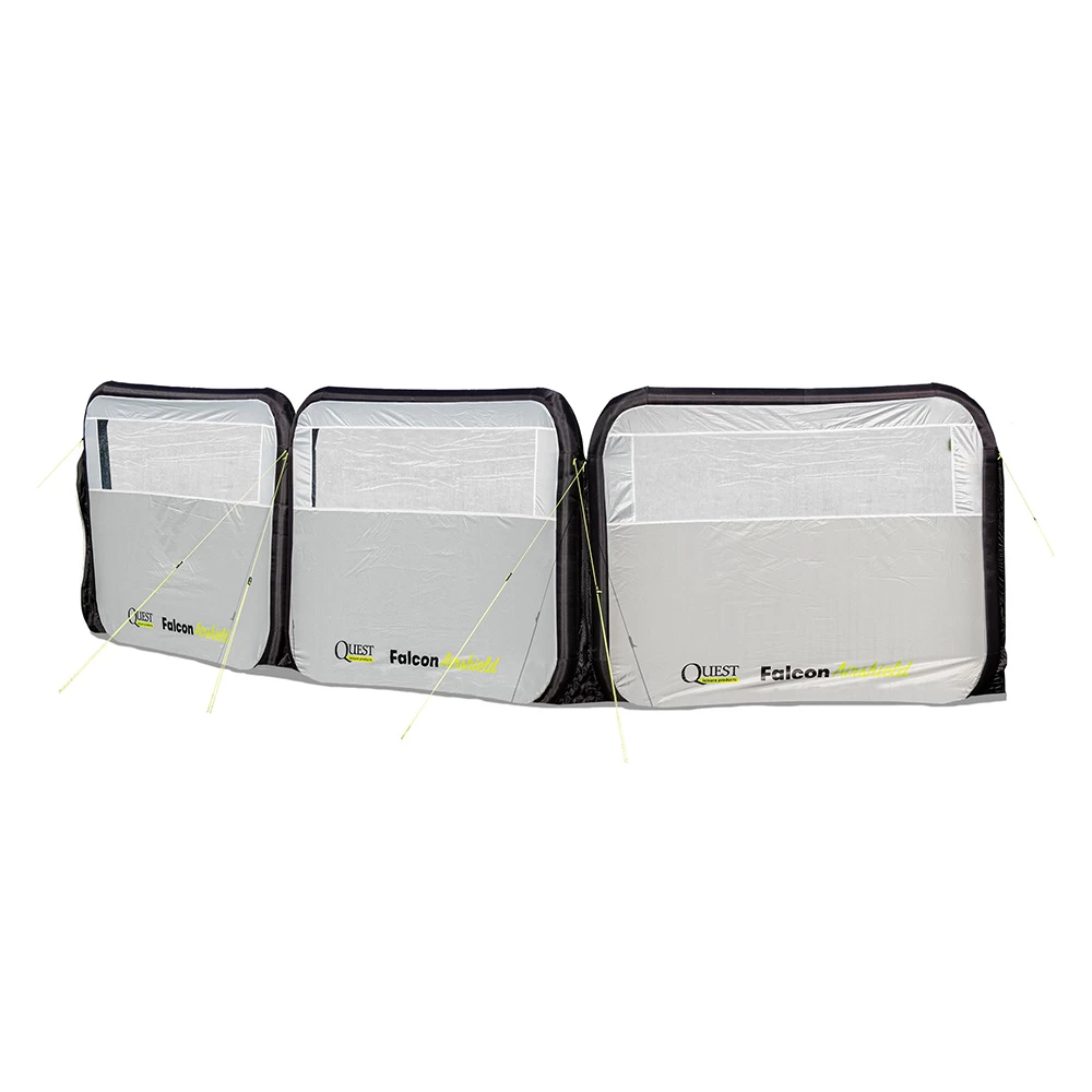 A great 3-panel AirShield Windbreak from Quest, featuring QuestTec 150D lightweight performance fabric and quick pitching Falcon AirTec technology. The 3 panels offer up an impressive 500cm of protection when zipped together, with a window featuring in each panel to retain a view of your surroundings. The windbreak can be pitched in as little as 3 minutes with two persons and is modular, featuring zips to extend to any size.