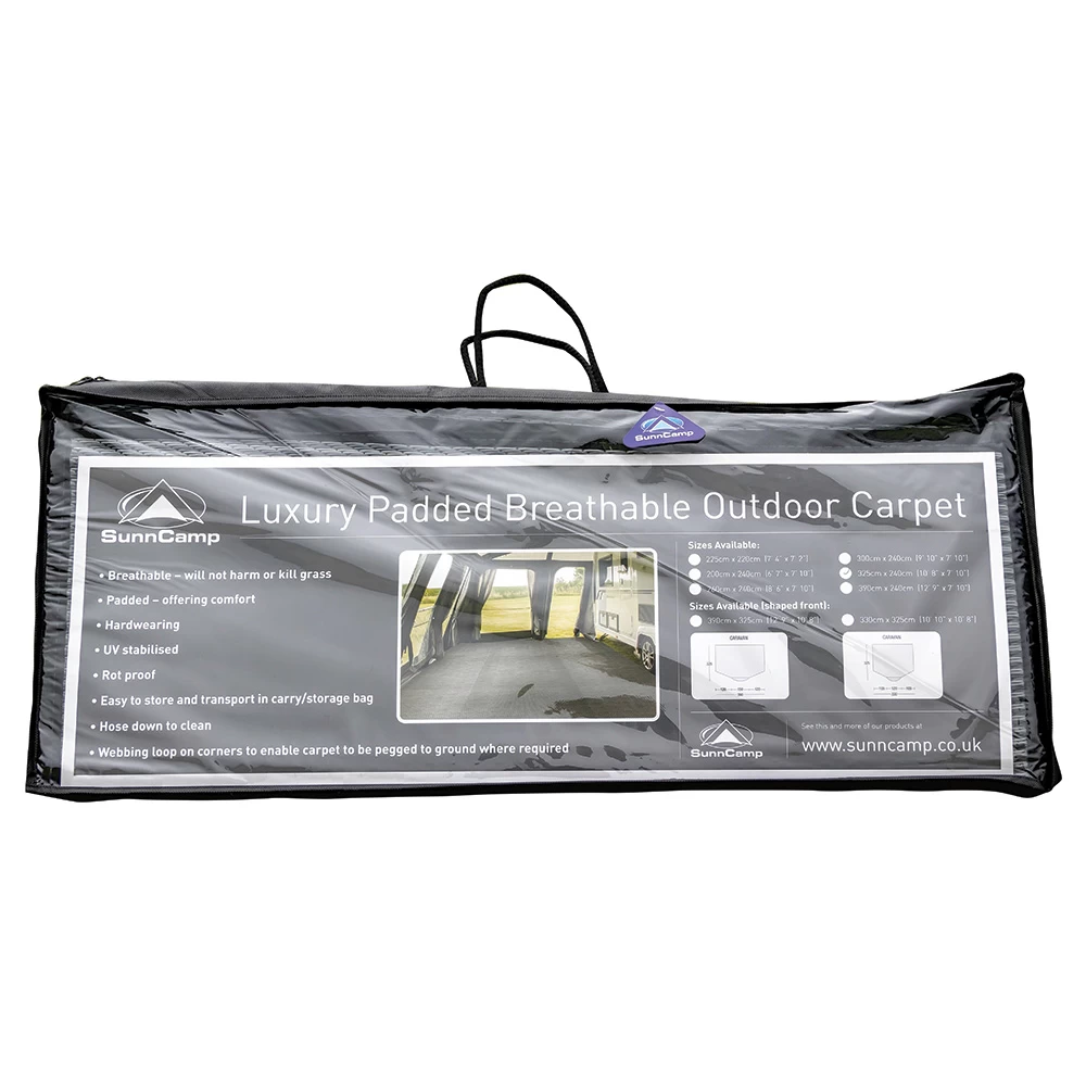 This luxury padded breathable awning carpet will perfectly complement your Sunncamp awning, adding warmth and comfort underfoot. The carpet is durable, UV stabilised and rot proof for longevity, whilst the breathable nature means it will not harm or kill the grass beneath. Easily cleaned by simply hosing down, this luxury carpet features webbing loops to the corners to enable the carpet to be pegged to the ground where required.