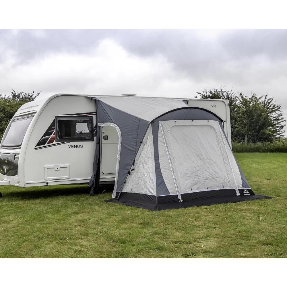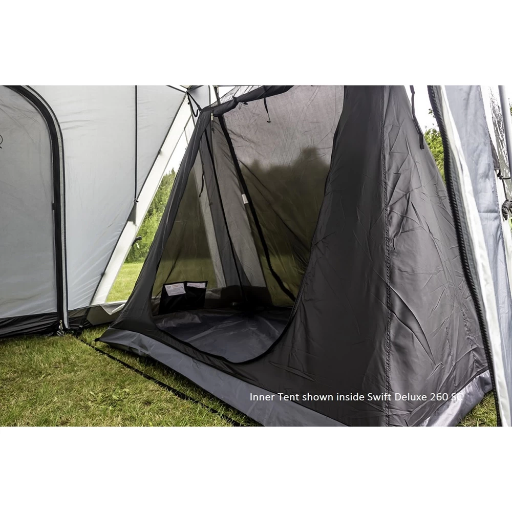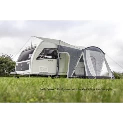 Quick, simple and capable, the Swift Deluxe SC 220 features an Ace-Tech 75D polyester fabric with 6000mm HH for great weather protection, whilst the external peggable mud wall and included draught skirt enhances protection from the elements. Easy to erect and take down, it has a relatively compact pack size, making it easy to transport, whilst providing you with a versatile space to enjoy alongside your caravan. A great list of features is on offer, including two side doorways, privacy curtains and a roll-up front door, that can be transformed into a canopy using optional canopy poles.