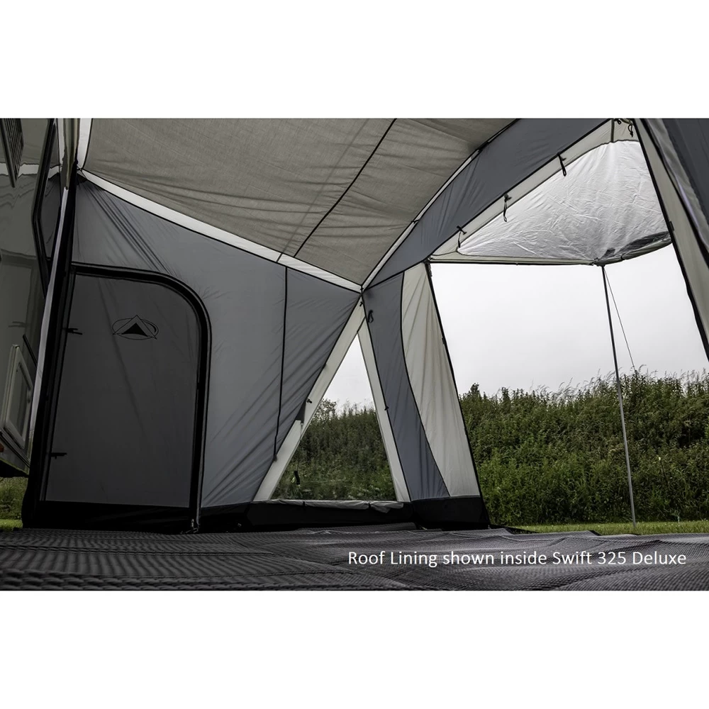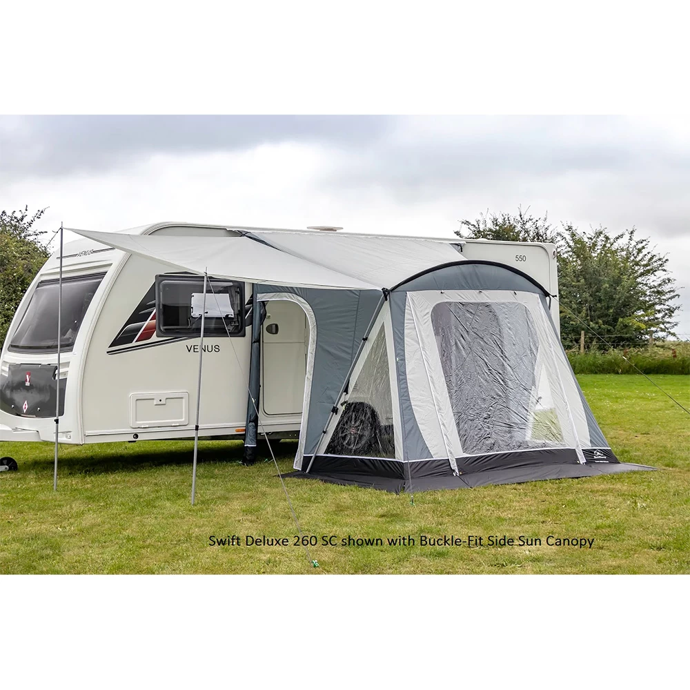 Simple and capable, the Swift Deluxe SC 260 features an Ace-Tech 75D polyester fabric with 6000mm HH for great weather protection, whilst the external peggable mud wall and included draught skirt will enhance protection from the elements. Offering a relatively compact pack size whilst providing you with a versatile space to enjoy alongside your caravan, the Swift Deluxe 260 SC has the option of expanding sleeping provision with an optional two berth inner. A great list of features includes two side doorways, privacy curtains and a roll-up front door, transforming into a canopy using optional canopy poles.
