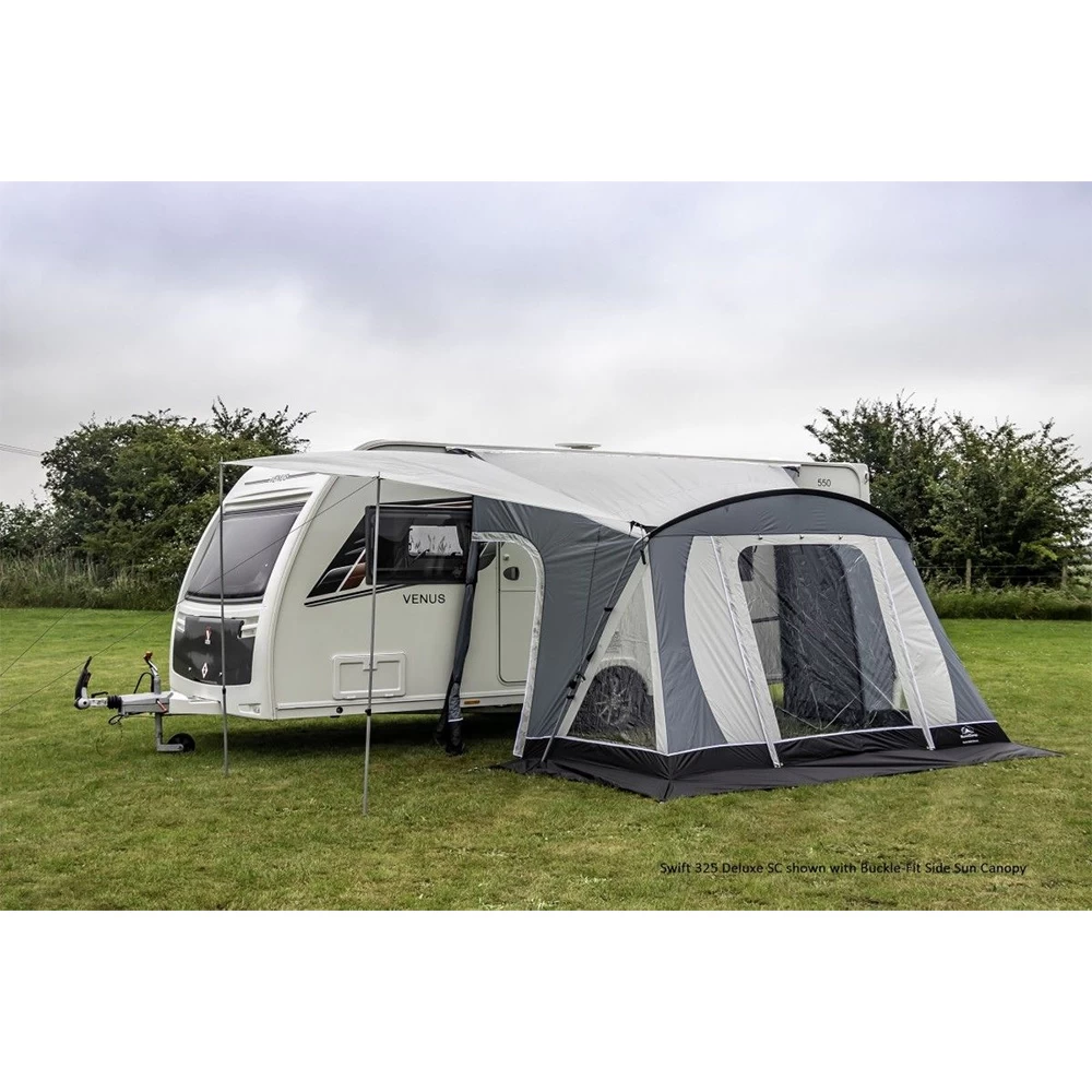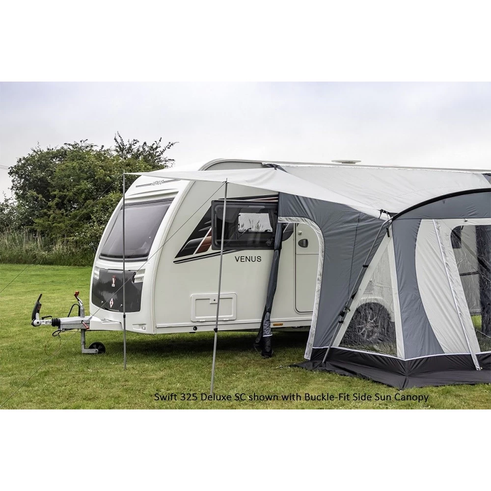 Sporting a fresh stylish new look, this simple yet versatile Swift Deluxe 325 SC Awning provides a feature-packed space alongside your caravan. A steel and fibreglass frame provides sturdy support, whilst large windows with curtains make the Swift Deluxe a nice place to relax, enjoying your surroundings from the comfort of your awning. A number of optional extras are available to further tailor your setup, including poles for a front door canopy, optional roof lining and new buckle-fit side sun canopy compatibility (will fit either side of the awning).