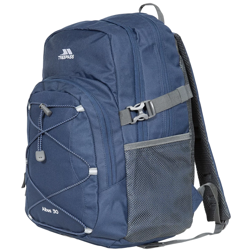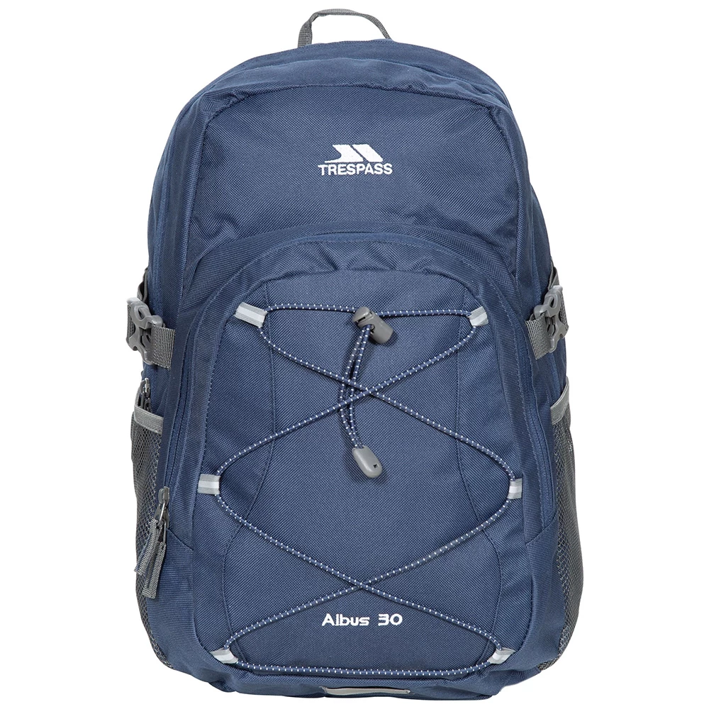 A capable 30L rucksack with some excellent features, including 3 zipped compartments, concealed internal pocket organiser and elasticated mesh pockets. Elasticated webbing at the front for flexible secure storage, daisy-chain and D-ring storage options for securing carabiner clips, walking poles and other essentials at the straps add to the versatility of the Navy Albus 30 from Trespass. The bulk of your load can be reduced using adjustable compression straps when required, whilst the main compartment has a dual zip fastening allowing for padlocking for enhanced security and features fast-access pull tabs for ease of use. Comfortable too, the Albus 30 has adjustable padded shoulder straps and back, offering added comfort and support. Adjustments here help you find the perfect fit.