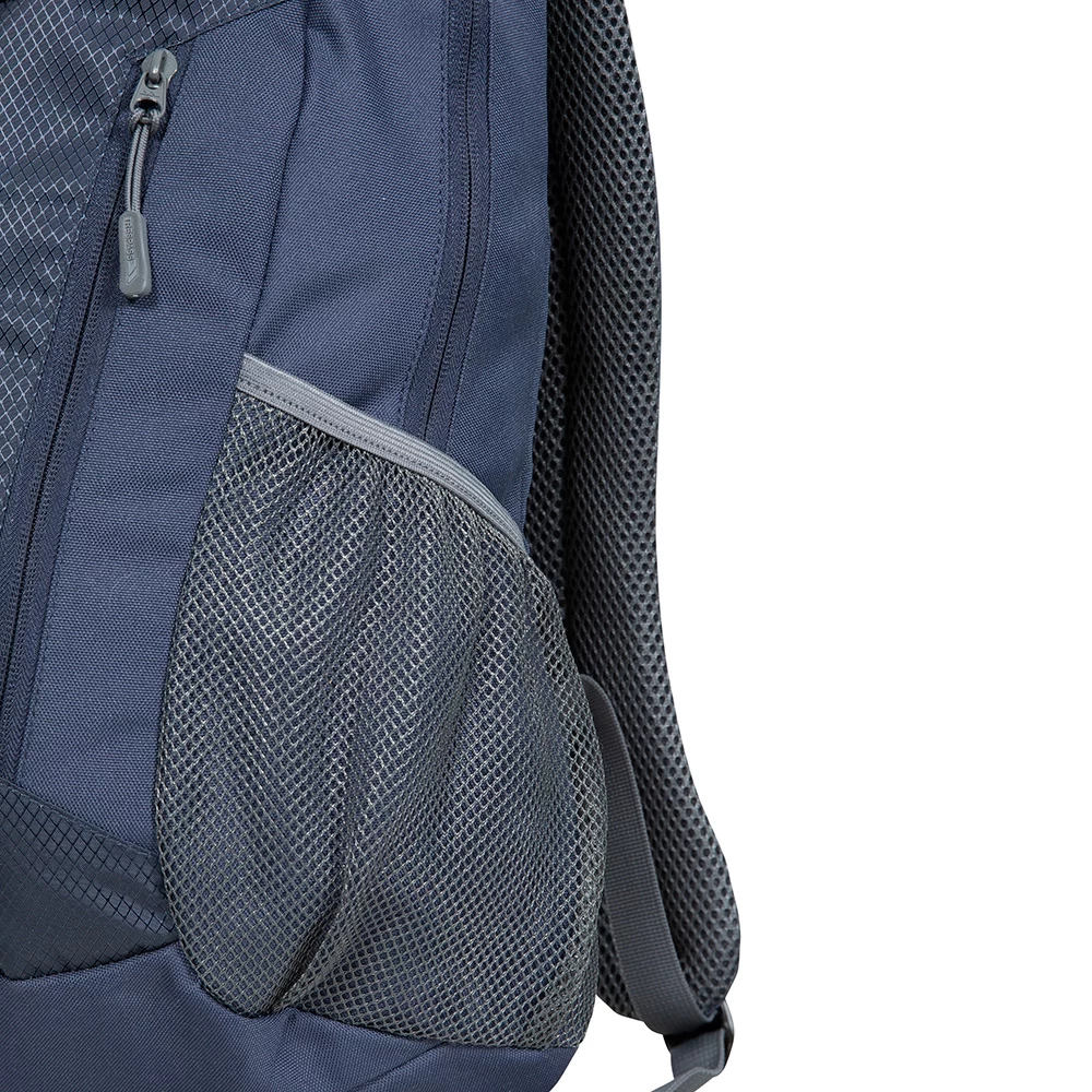 - 25L backpack with 3 zipped compartments, internal laptop pocket and mesh side pockets.