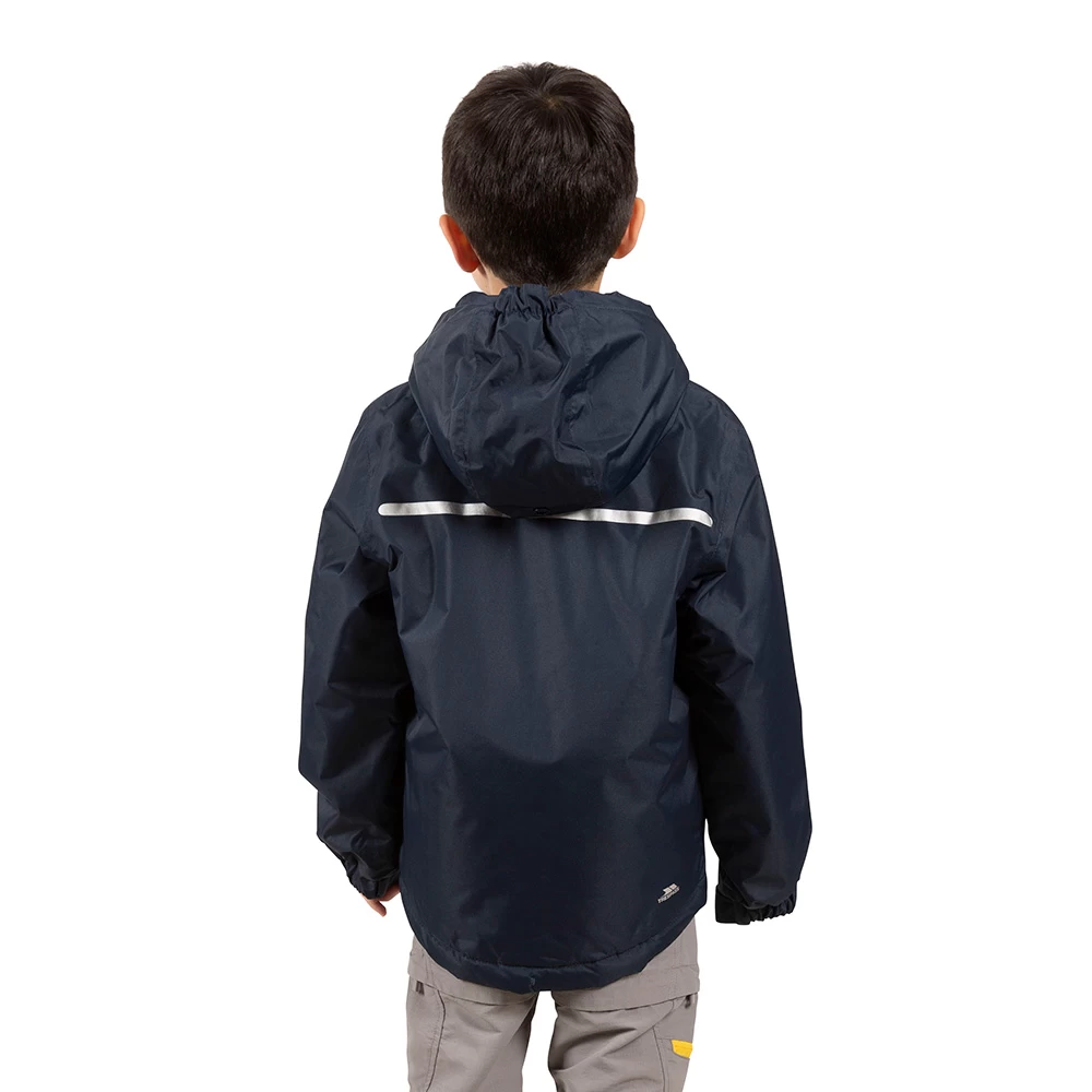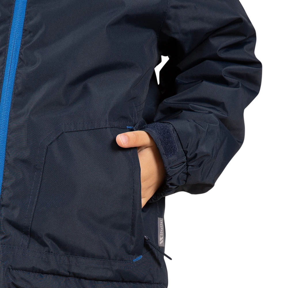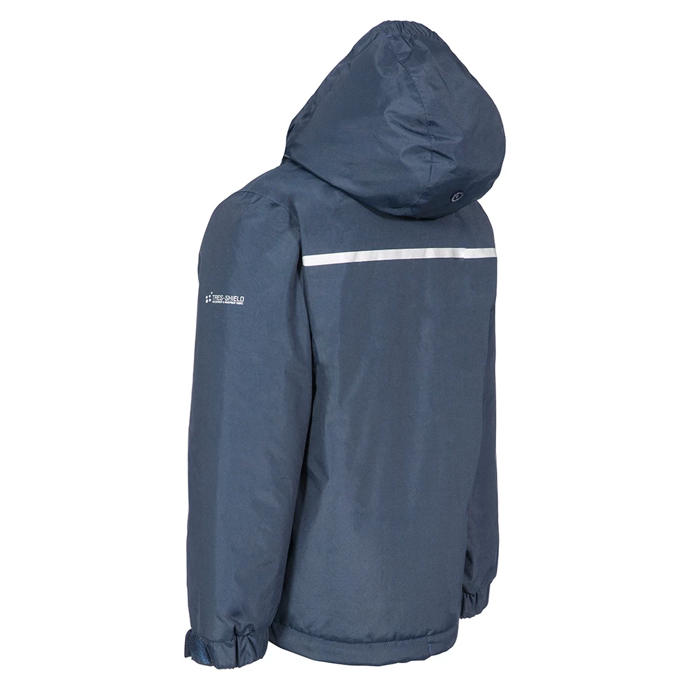 Simple yet very effective, the kids Rudi Waterproof Jacket from Trespass offers great weather protection, featuring Tres-Shield fabric rated to 3,000mm HH. Coldheat insulation utilises soft lofted fibres to trap and hold bodyheat, keeping you warm whilst offering good freedom of movement. Cuffs are elasticated with Velcro tabs to further help seal out the elements, aided by a hem drawcord. Two zipped pockets offer practicality on the move and the jacket is finished with a subtle Trespass chest logo and a reflective stripe on the back. Available here in the navy colourway.