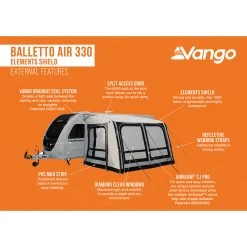 Featuring Vango’s revolutionary AirBeam® Single Point Inflation and Multi-Point Deflation, the mid-sized Balletto 330 Air Caravan Awning has an amazingly quick pitch and pack-up time. The compact size of the Balletto combined with Elements Shield fabric makes this inflatable awning lightweight and easy to transport, with an optional annex available to expand space if required. A fantastically versatile weekender and beyond, whether used for enjoying meals, storage or relaxation, the Balletto 330 Air does it all.